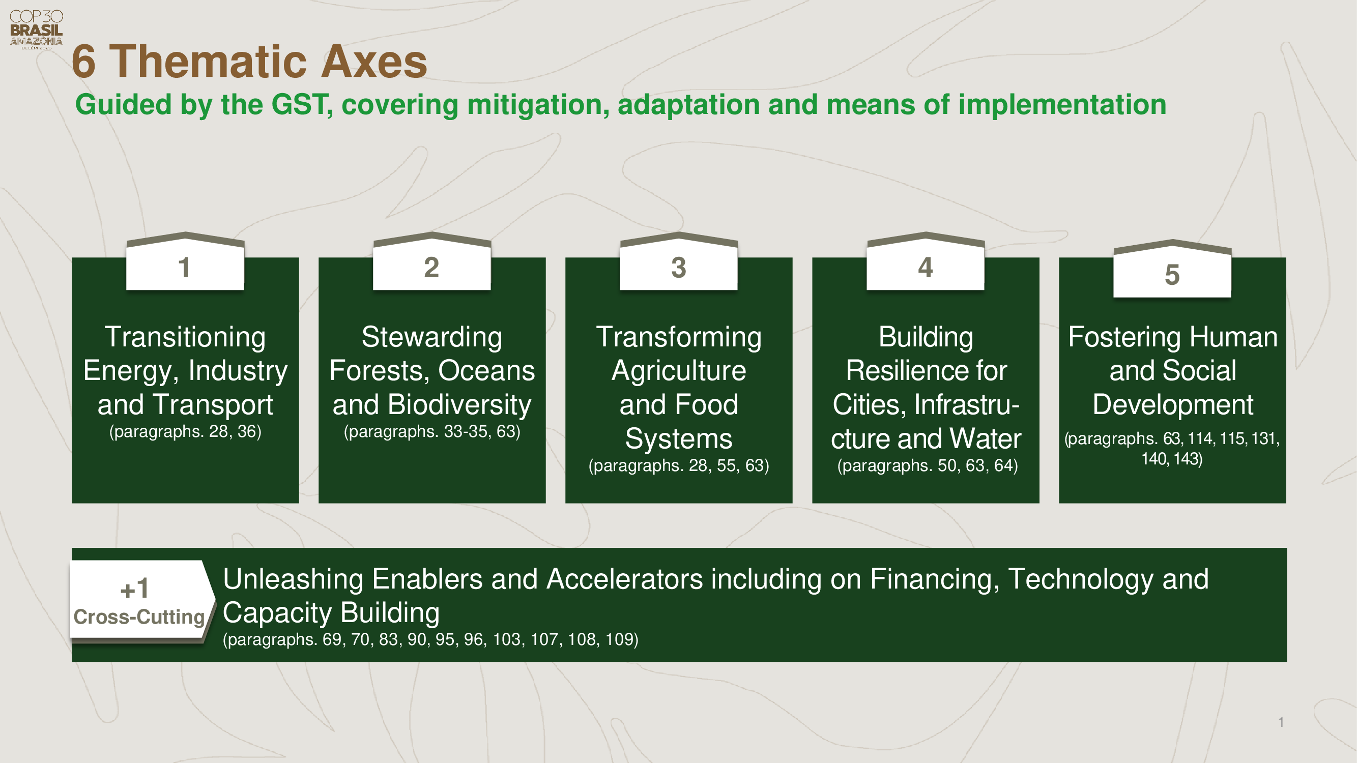 The COP30 Presidency proposes translating the results of the Global Stocktake into six major thematic pillars and thirty key objectives, which will be advanced through multiple solutions.