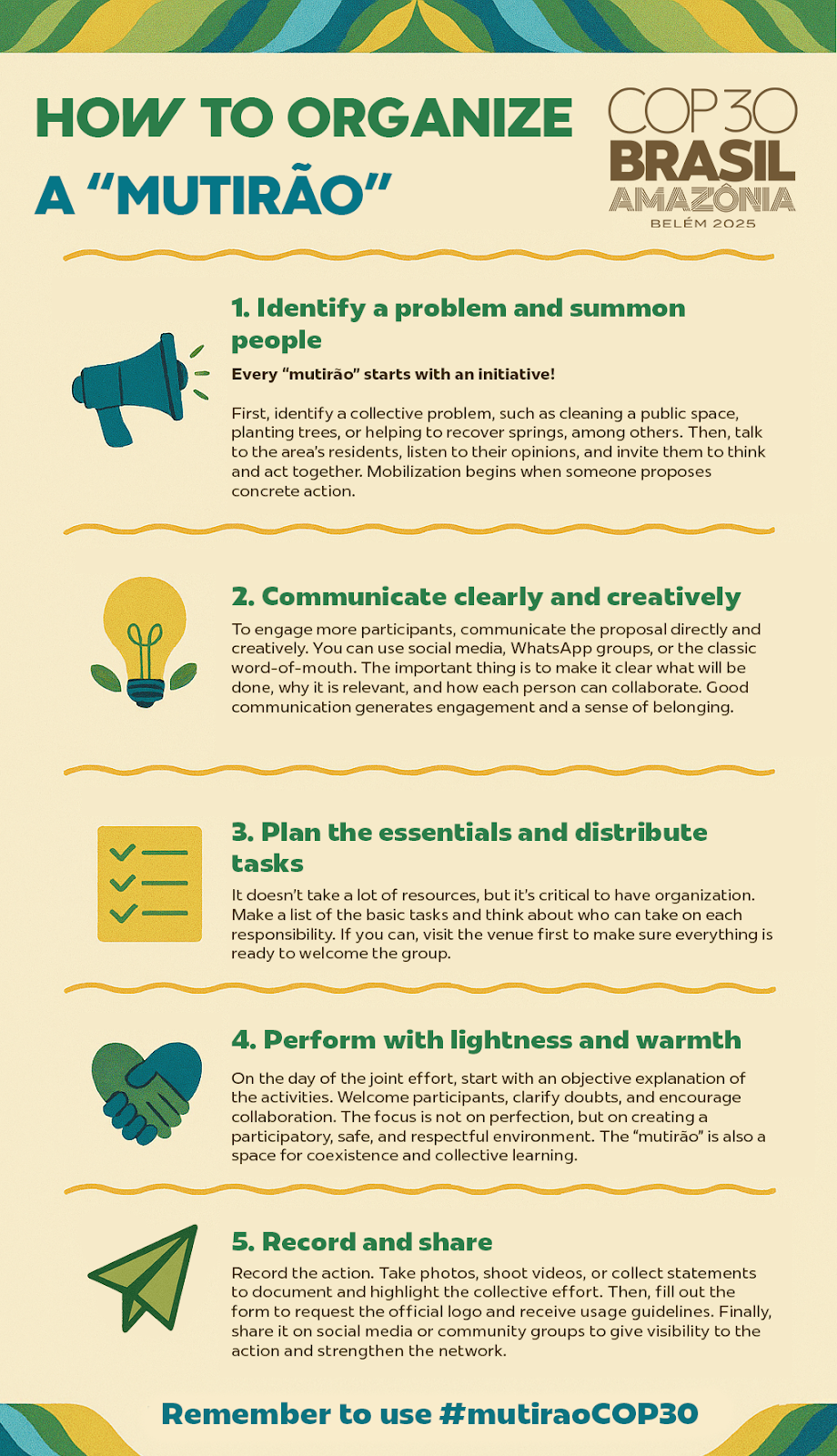 A mutirão can also take place remotely. Digital mobilizations, awareness-raising campaigns, surveys, collective drawings, and webinars can bring together people from different territories around a shared purpose. When many people share information, stories, images, and educational messages, the impact grows and new networks emerge.