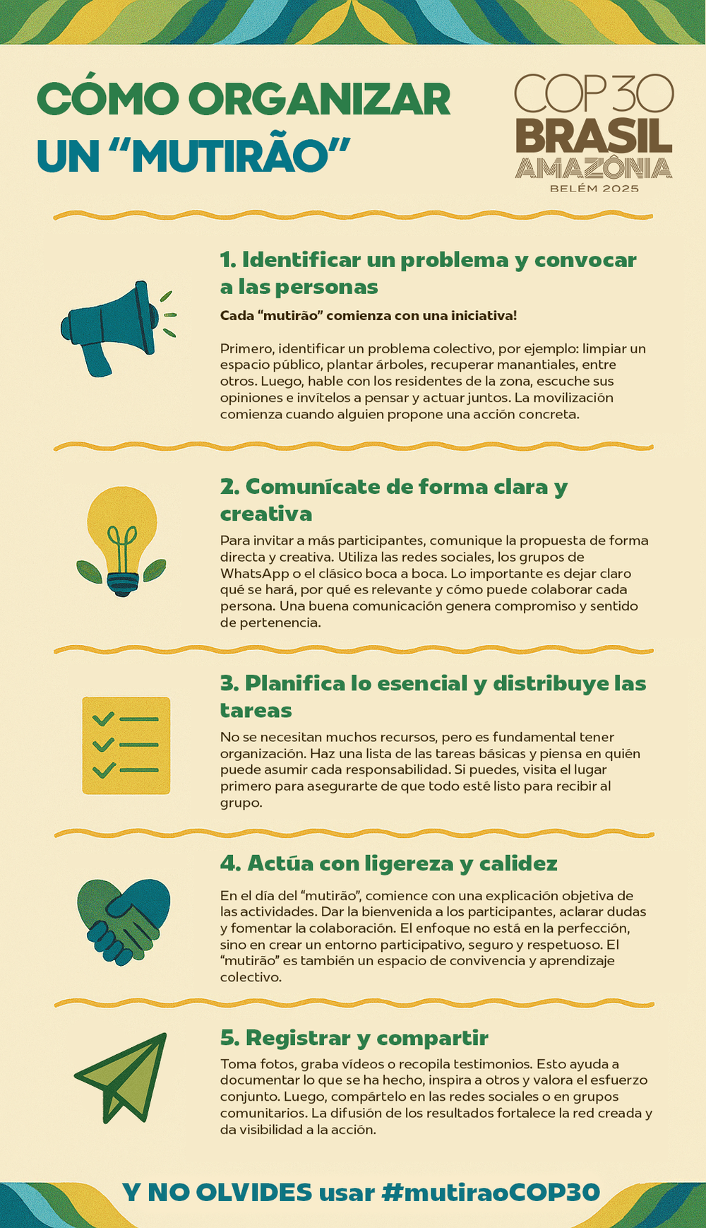 ¡Ahora es con ustedes! Queremos saber: ¿qué “mutirões” ya están en marcha? Comparte con nosotros las acciones que están transformando realidades en tu barrio, en tu escuela, en tu territorio. Cada iniciativa cuenta, inspira y fortalece esta red de movilización. Demostremos juntos que cuando nos unimos, lo imposible se hace posible. Cuéntanos: ¿qué es lo que ya estás haciendo que suceda? mobilization@cop30.br