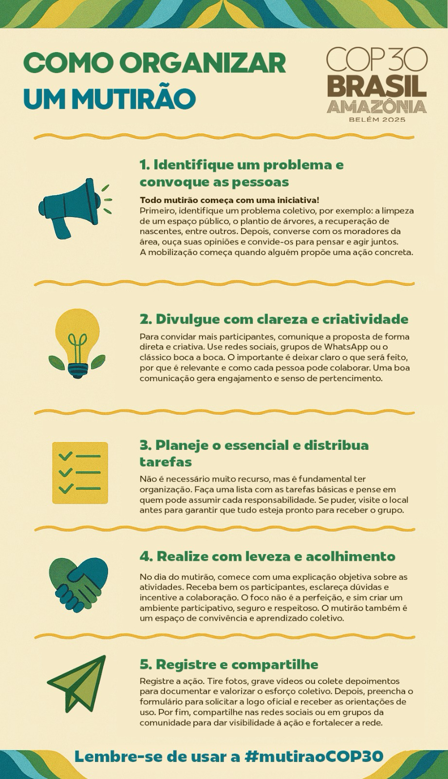Dê espaço para perguntas e trocas, registre o encontro e compartilhe os resultados. Mesmo no ambiente digital, o mutirão segue gerando laços, inspiração e impacto real.
